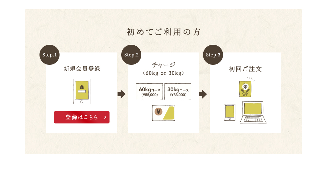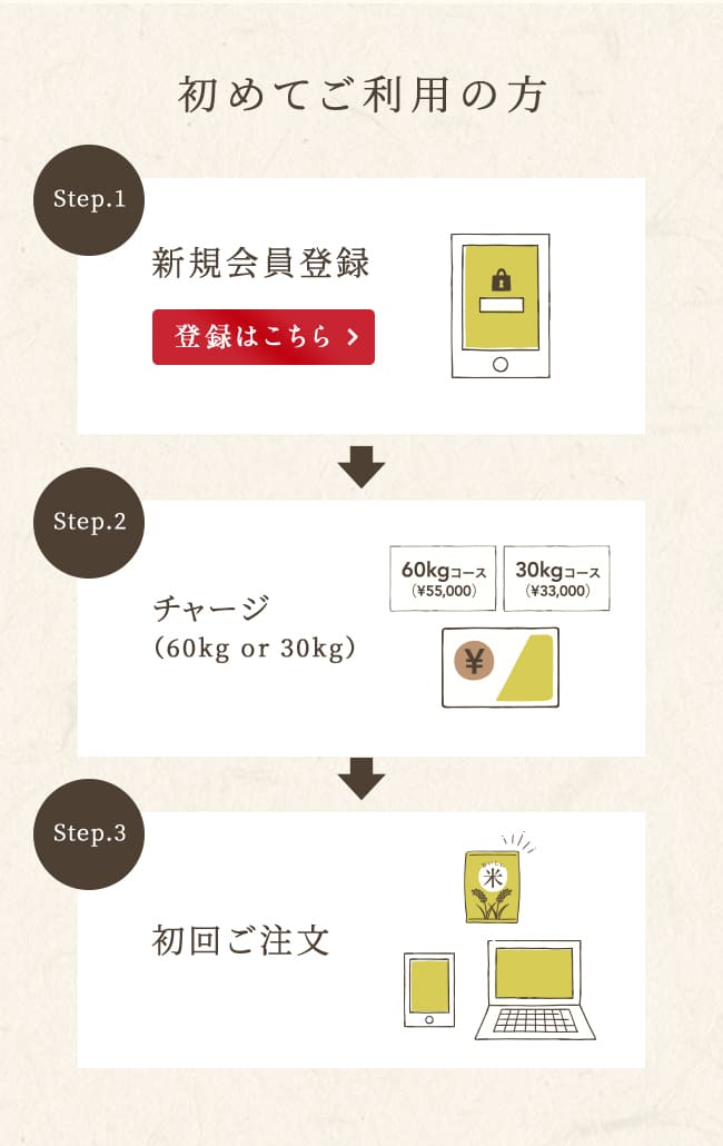 30kg、60kgをまとめて購入のシステムなので、急な出費であわてることがありません。また、ご家族だけでなくご親族へのお裾分けやご友人への贈り物としてもご利用いただけます。