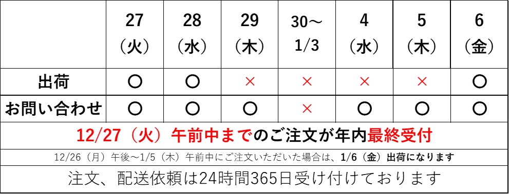 2022年~2023年の【ふるさと納税】ライスストレージ ライトコース年末年始の営業、出荷については下記の通りになります。
