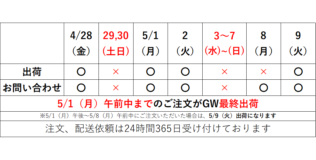 ゴールデンウィーク期間中の配送につきましては、下記の通りになります。