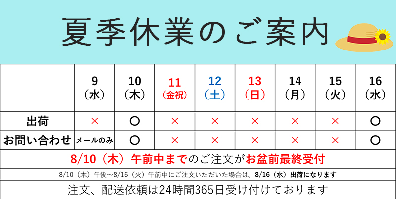 台風6号接近に伴いまして、9日(水)の出荷を停止させていただきます。