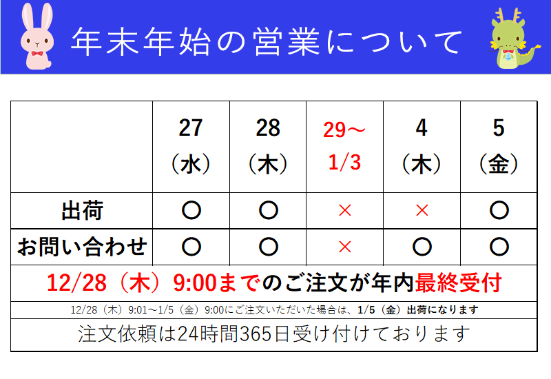 2023年~2024年の年末年始の営業、出荷については下記の通りになります。