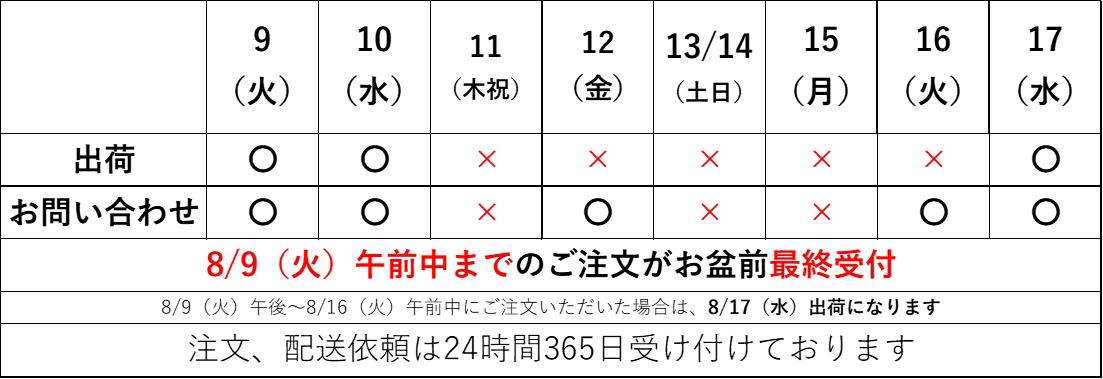 平素より九州ライスストレージをご利用いただきまして、ありがとうございます。お盆期間の受注、精米、配送などにつきましては下記の通りになります。期間中はお届けにお時間を頂きますが、何卒ご了承くださいますようお願い申し上げます。