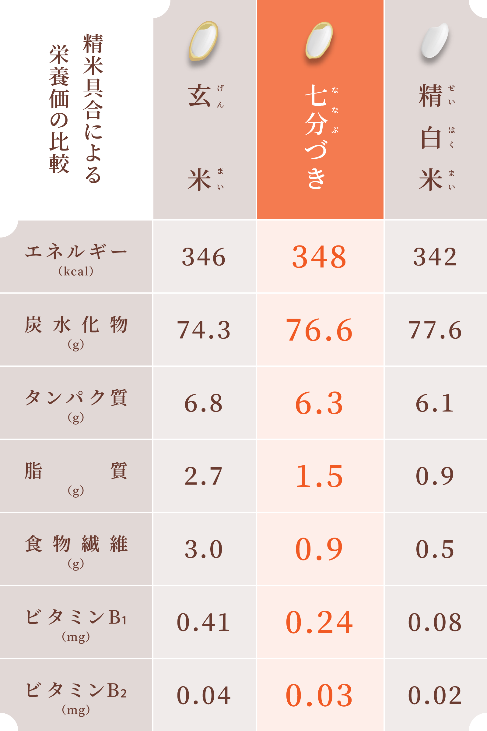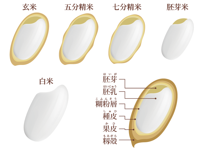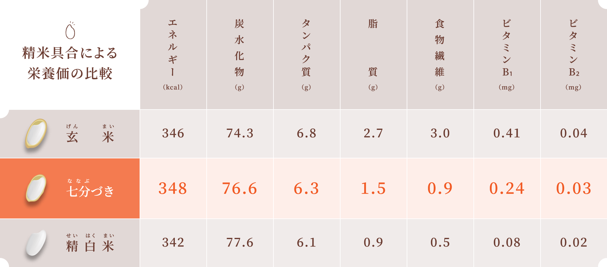玄米には、栄養豊富なヌカ層と胚芽がついています。その部分を7割取り除いたお米は「七分づき」、5割取り除いたお米は「五分づき」と、取り除いた割合を表します。